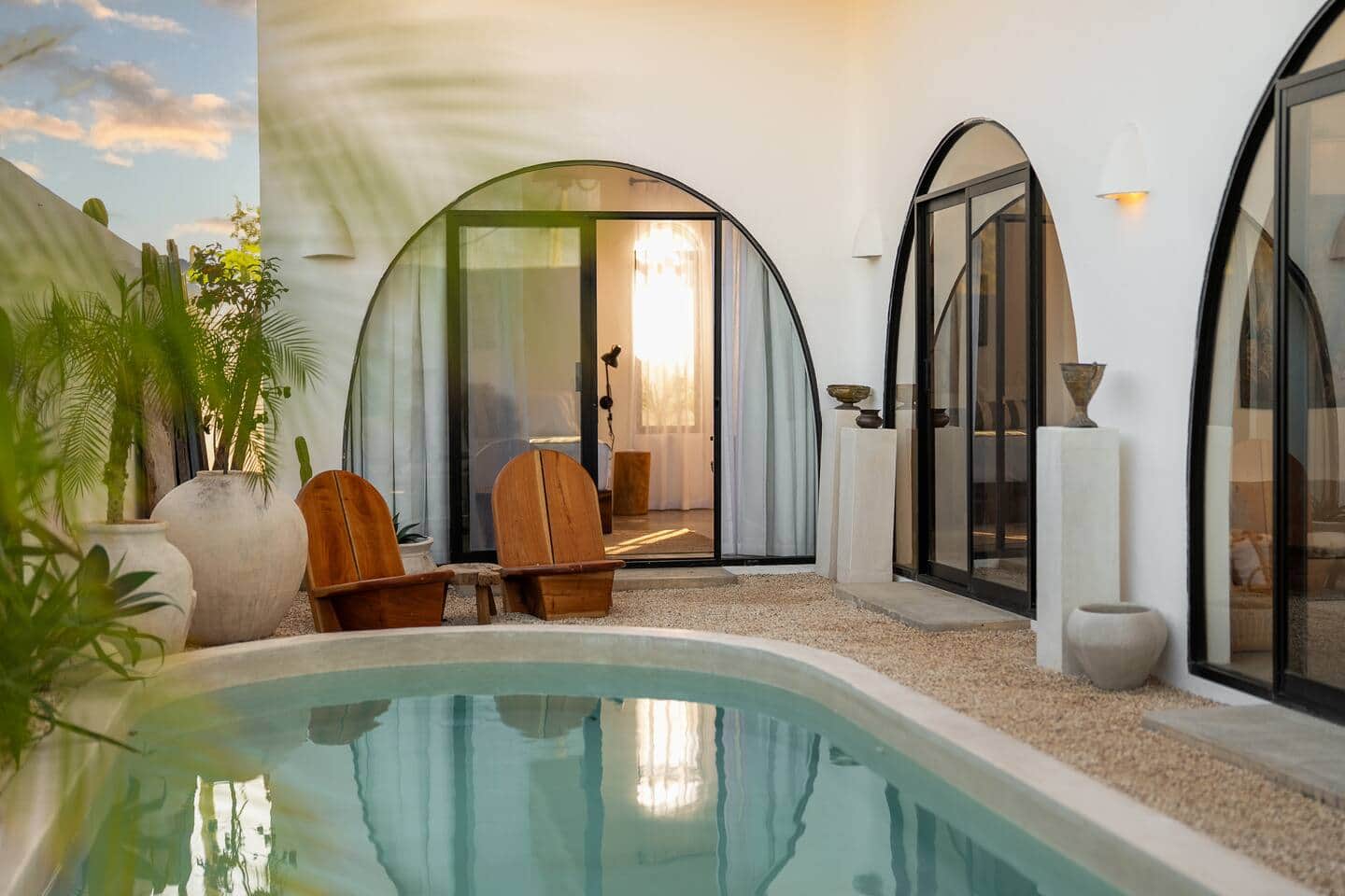 arcos, espacios abiertos, vegetación, gravilla, muros claros, techos altos y acabados naturales como cemento pulido.